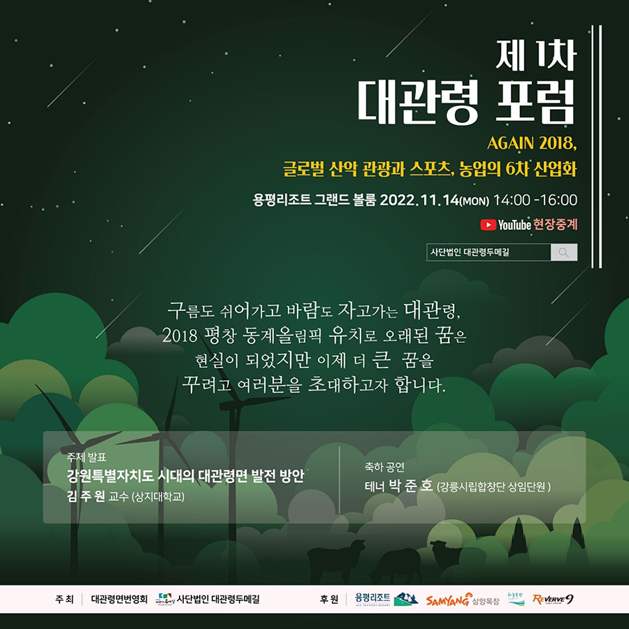 제1차 대관령 포럼 - 글로벌 산악 관광과 스포츠, 농업의 6차 산업화 페이지 정보 작성자대관령두메길 댓글댓글 0건 조회조회 6,030회 작성일 22-11-13 21:31 본문 ... 목록 이전글 2023년 신년인사 및 연회비 입금 안내 23.01.11 댓글목록 댓글목록 등록된 댓글이 없습니다.